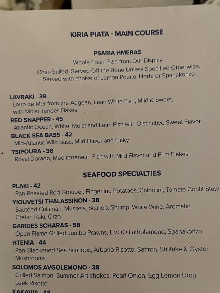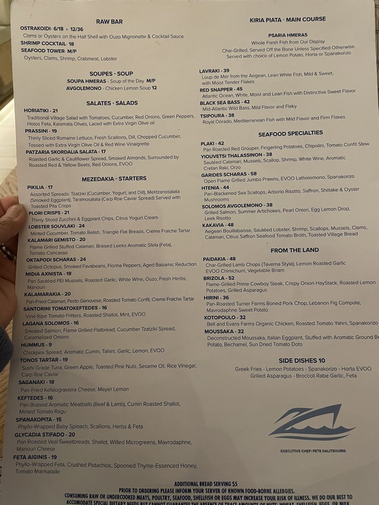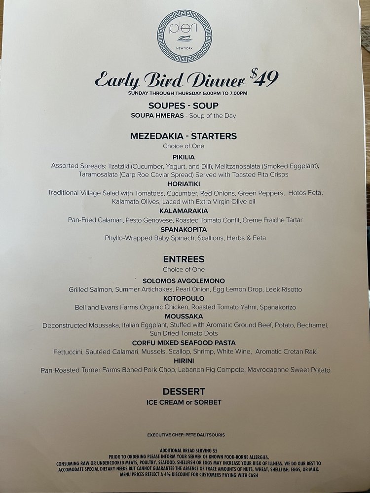 Includes: appetizer, entree & dessert. Appetizers : greek salad, spanakopita. Entre: orzo a la ouzo, chicken souvlaki, pita lahanikon. Dessert chef selection.